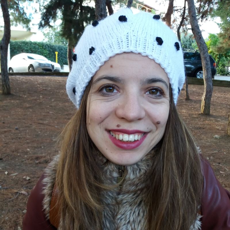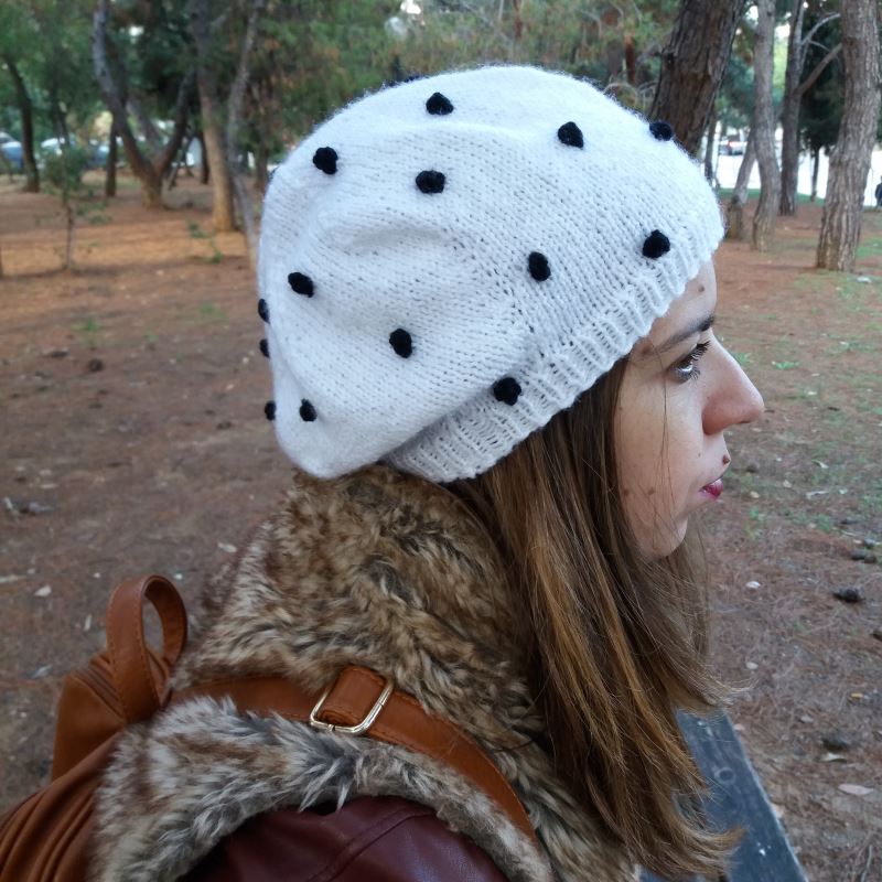 Πλεκτό χειροποίητο λευκό σκουφάκι με μαύρες λεπτομέρειες.